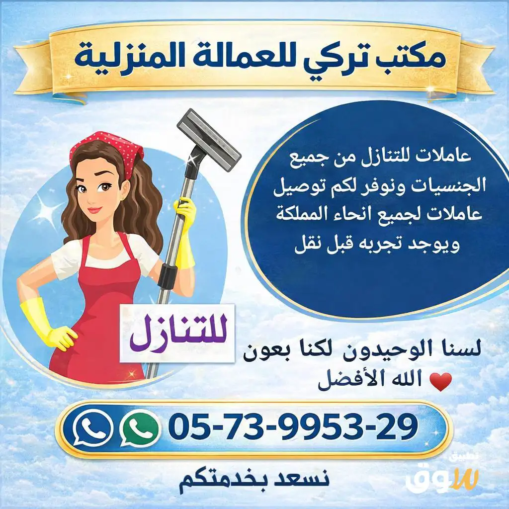 حيااااكم الله عملائنا الكرام✨✨ نعلن عن وجود خادمات للتنازل ممتازين بالعمل لنقل الكفالة. ✨ملحوظه ✨ يوجد قسم خاص لاستقبال الخدم (ويوجد ارسال نقل جماعي او طيران) نحن في خدمتك يا فندم اذا كنت تبي تتنازل عن خادمتك بطريقة نظامية لضمان حقك وحق الخادمة. انت وخادمتك معنا في أمان بفضل الله🍁. ثقة لا تنتهي بعقود موثقة ومضمونه ( لسنا الوحيدون ولكننا بفضل الله نرضيك ) ابوريان للتواصل اتصال او واتساب0573995329