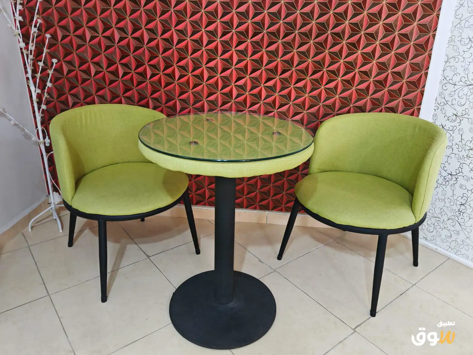 هذه طاولة مقهى صغيرة ذات سطح زجاجي وقاعدة سوداء، محاطة بكرسيين مبطنين باللون الأخضر الفاتح.